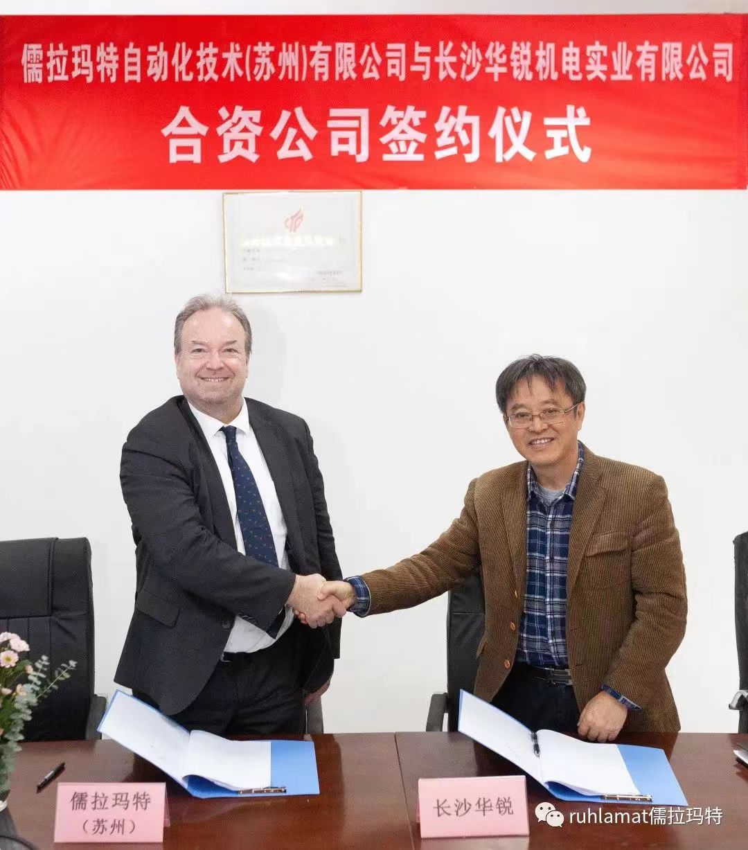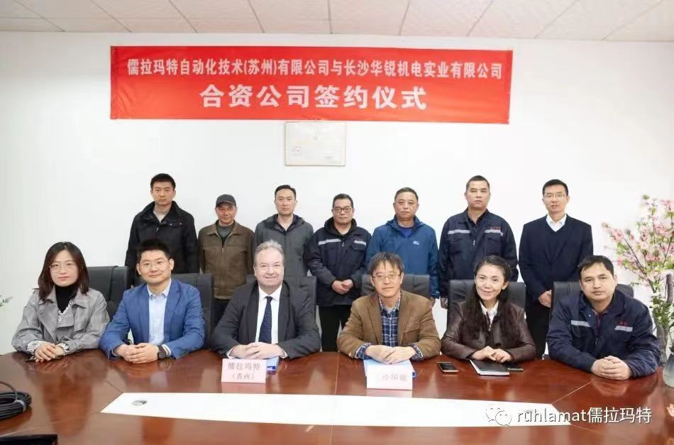 儒拉瑪特自動(dòng)化技術(shù)(蘇州)有限公司與長沙華銳機(jī)電實(shí)業(yè)有限公司在長沙舉辦了合資公司簽約儀式,儒拉瑪特(蘇州)董事總經(jīng)理白世泰先生與長沙華銳總經(jīng)理王小明先生簽署合作協(xié)議。